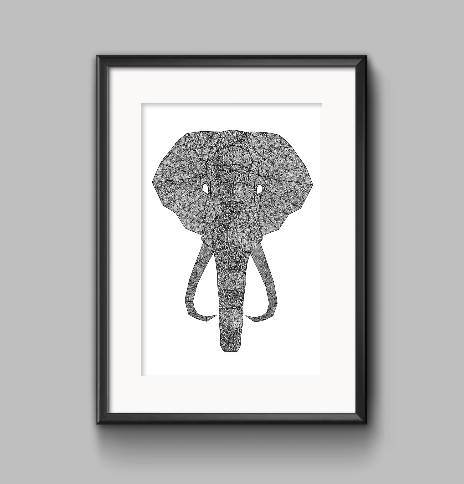 This hand-drawn print is a highly detailed, geometric illustration of an elephant's head. The artwork creatively blends intricate patterns and polygonal shapes, giving it a modern yet organic aesthetic. This piece is a fusion of realism and abstraction, where the geometric framework contrasts beautifully with the organic subject. It carries a modern, tribal, and contemporary feel, making it ideal for artistic prints, tattoos, or statement wall art.
