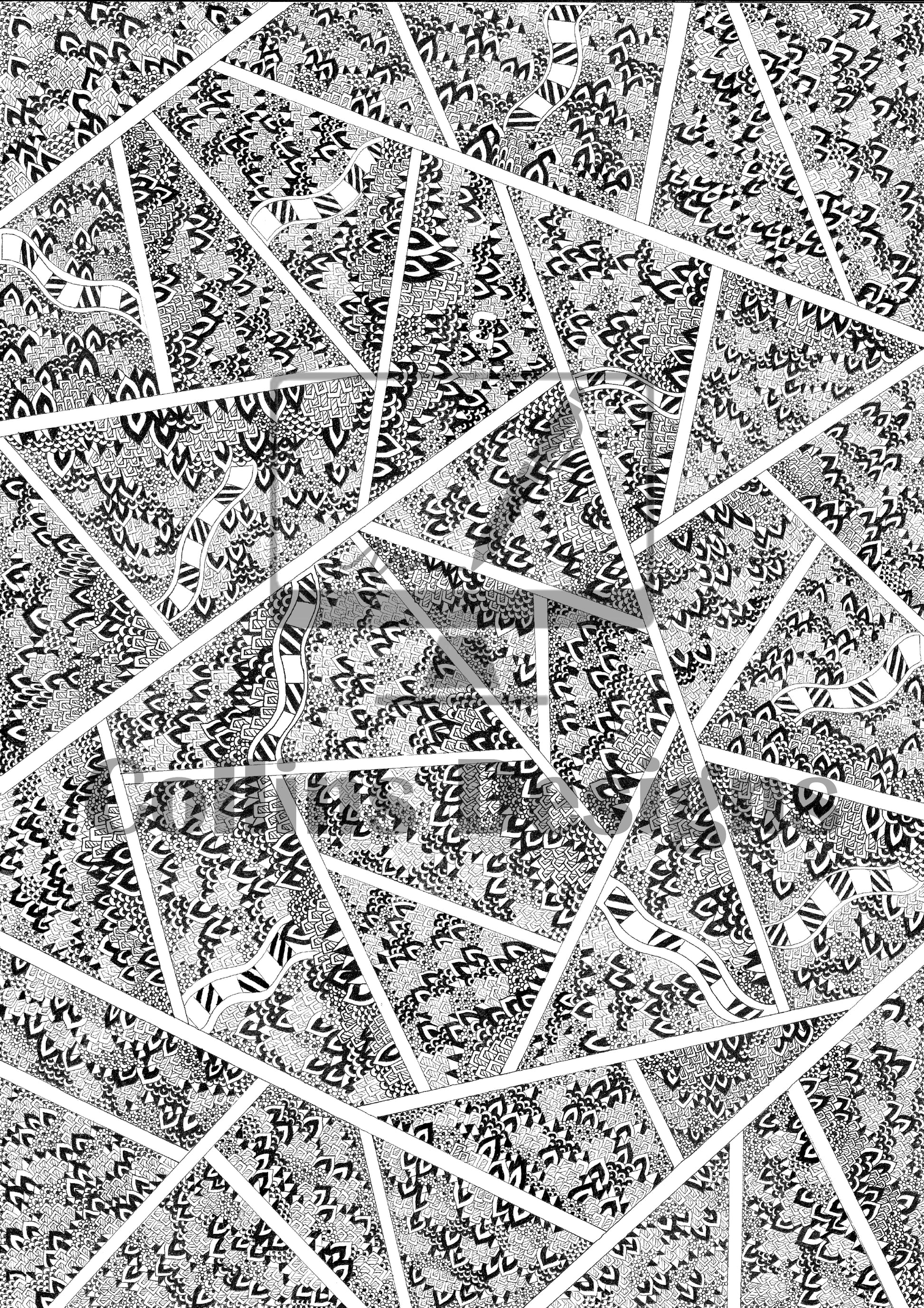 A black and white hand-drawn abstract pattern design. The pattern is composed of numerous irregular triangles filled with dense, intricate, and somewhat chaotic pattern of small, repetitive graphic elements. These elements resemble squiggles, swirls, and fine lines in varying densities and orientations. The triangles are outlined by thin, crisp white lines that define their shape and create a sense of fragmentation and layering. The overall effect is a complex, textured, and visually busy design.
